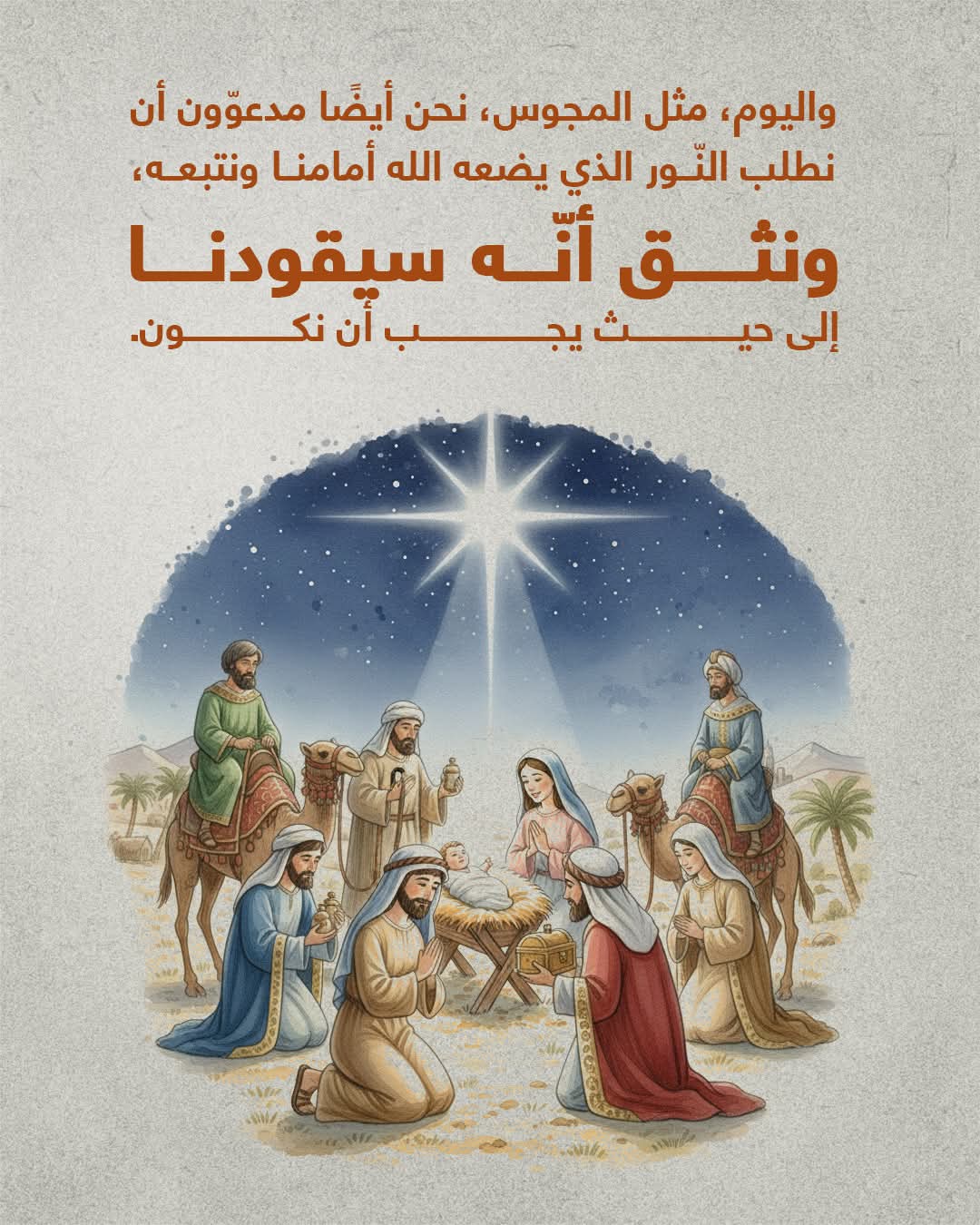 So Abadir arose and left Alexandria, pondering, "Where is Mother Irai in relation to that place?" He kept saying, "Will God forget us in the place of our foreignness? My Lord Jesus Christ told me, 'I will tell you what will happen to you in the city of Alexandria.'" While the blessed Abadir was praying, his body had no strength left for the ascetic practices he was undertaking. Then the place where he was standing was completely illuminated, and he saw a hand from the midst of the light pointing at him. He followed it and went out to wake his sister, but the Savior did not allow him to do so, but said to him, "Do not disturb her now." So he went out, trembling because of the voice that was following him. The Savior said to him: “Listen to me; get up so that you and your sister may go to the south of Egypt, for that place has already been blessed by my Father. Go along the beach of the river, and after five days you will reach Tarnut (now called Tarana in the Beheira Governorate), where you will cross the river. Then go south from that place to reach the fortress of Babylon, where you will ask for Abakragun (al-Batnuni), the monk from Banwan, and he will teach you the good struggle.