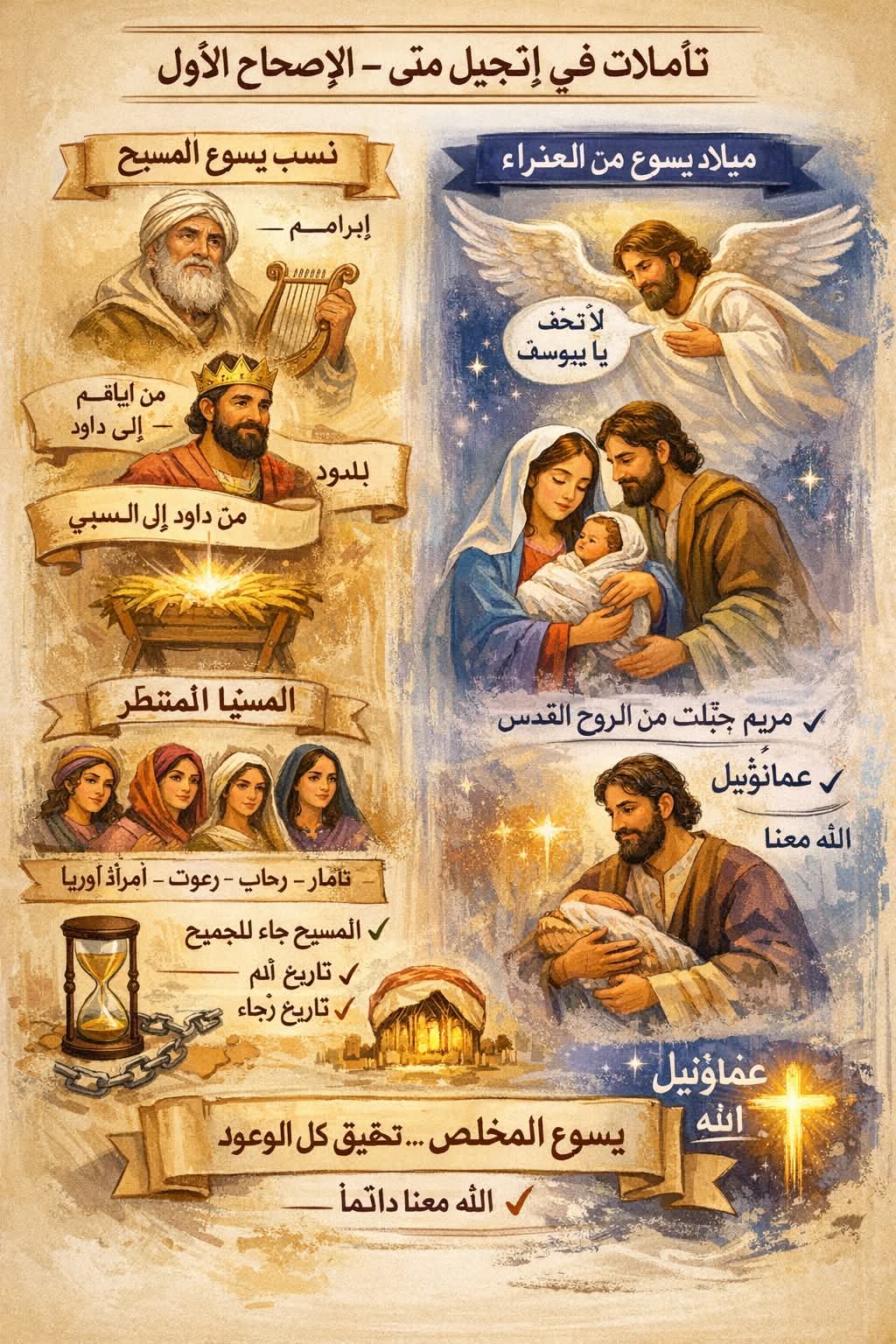| إنجيل متّى كُتب أساسًا لليهود، لذلك يبدأ بسلسلة نسب السيد المسيح ليؤكد أنه: من نسل داود الملك من نسل إبراهيم هو المسيّا المنتظر الإصحاح ينقسم إلى جزئين: نسب يسوع المسيح (آيات 1–17) ميلاد يسوع من العذراء مريم (آيات 18–25) ثانيًا: تفسير الإصحاح «كِتَابُ مِيلَادِ يَسُوعَ الْمَسِيحِ ابْنِ دَاوُدَ ابْنِ إِبْرَاهِيمَ» ملاحظات مهمة في النسب: متّى يقسم النسب إلى ثلاث مراحل (14 جيلًا): من إبراهيم إلى داود من داود إلى السبي من السبي إلى المسيح ذُكرت نساء في النسب (ثامار – راحاب – راعوث – امرأة أوريا): بعضهن أجنبيات بعضهن لهن قصص صعبة تاريخ ألم تاريخ سقوط تاريخ رجاء وينتهي بـ يسوع المخلّص مريم حُبل بها من الروح القدس يوسف كان بارًا، لم يُرِدْ فضحها الملاك ظهر ليوسف في حلم وقال: «لا تَخَفْ أَنْ تَأْخُذَ مَرْيَمَ امْرَأَتَكَ» معاني الأسماء: يسوع = يخلّص عمانوئيل = الله معنا ثالثًا: التأمل الروحي نسب مليء بخطايا، سقوط، سبي… لكن الله كان يقود التاريخ بهدوء. الله قادر يخرج منه خلاصًا. يوسف لم يكن متشددًا ولا قاسيًا كان بارًا رحيمًا اسم عمانوئيل ليس فكرة بل حقيقة: في الألم في الحيرة في الضعف خلاصة الإصحاح يسوع هو تحقيق كل الوعود الله يدخل تاريخ الإنسان ليخلّصه لا ماضي يمنع الله أن يبدأ بك من جديد |