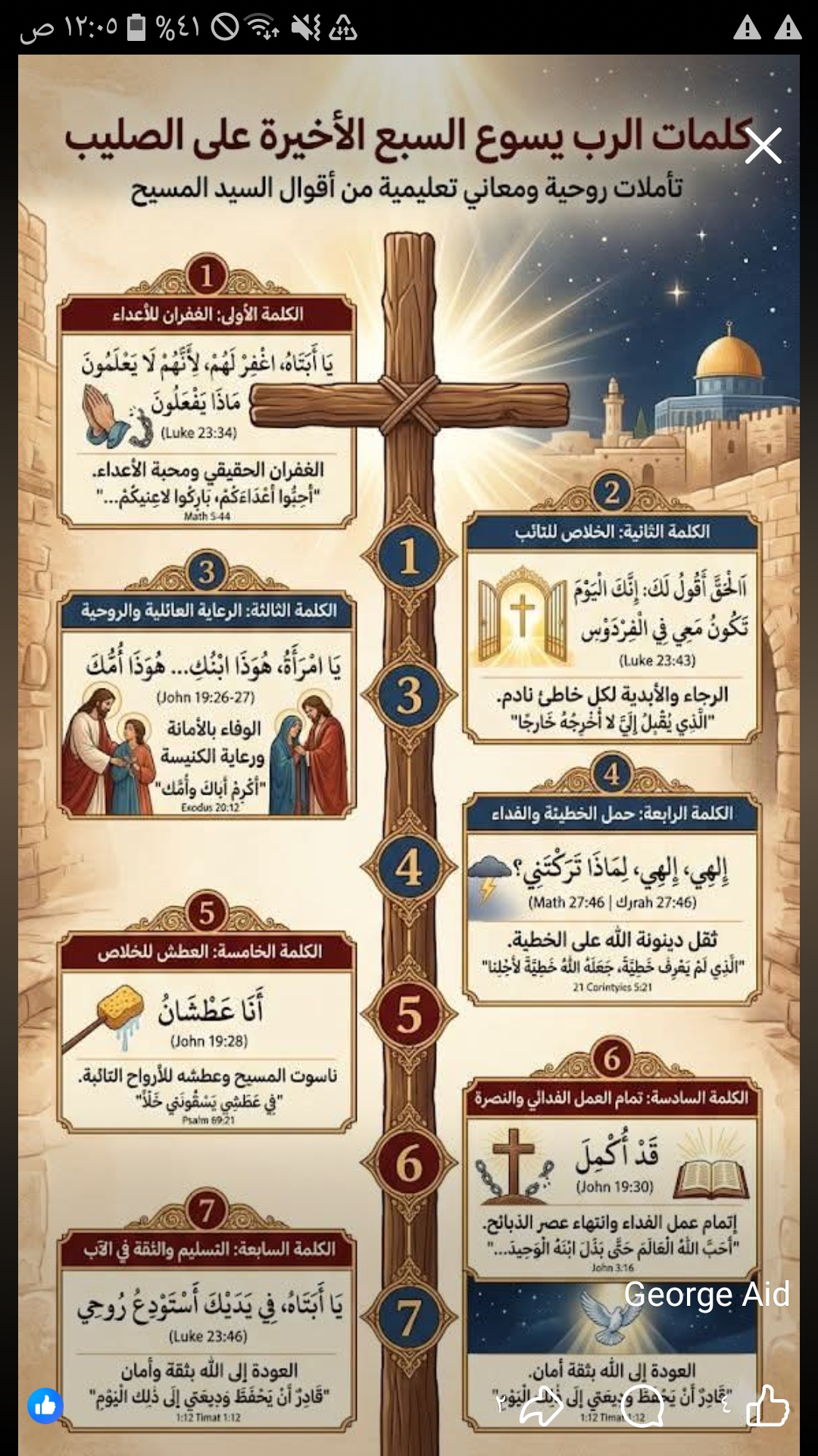 7 "يا أبتاه، في يديك أستودع روحي" لوقا 23: 46 التسليم: العودة إلى حضن الآب بسلام، وتعليمنا الثقة الكاملة في يد الله حتى الموت.