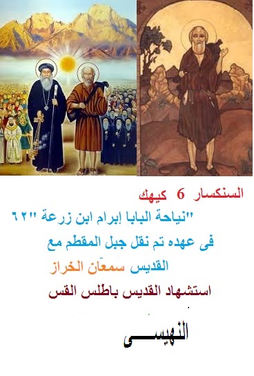 في مثل هذا اليوم من سنة 979 ميلادية(1) تنيح القديس أنبا ابرام بابا الإسكندرية الثاني والستون، كان هذا الآب من نصارى المشرق، وهو ابن زرعة السرياني وكان تاجرا ثريا وتردد علي مصر مرارا وأخيرا أقام فيها، وكان بتحلي بفضائل كثيرة، منها الرحمة علي ذوي الحاجة، وشاع ذكره بالصلاح والعلم، وعندما خلا الكرسي البطريركي، اجمع رأي الأساقفة والشيوخ العلماء علي اختياره بطريركا، فلما جلس علي كرسي الكرازة المرقسية وزع كل ماله علي الفقراء والمساكين، وفي أيامه عين قزمان الوزير القبطي ابن مينا واليا علي فلسطين، فأودع عند الآب البطريرك مئة آلف دينار إلى إن يعود، وأوصاه بتوزيعها علي الفقراء والمساكين والكنائس والأديرة إن مات هناك، فلما بلغ البطريرك خبر استيلاء هفكتين علي بلاد الشام وفلسطين، ظن إن قزمان قد مات، فوزع ذلك المال حسب الوصية، ولكن قزمان كان قد نجا من الموت وعاد إلى مصر فاخبره الآب بما فعله بوديعته فسر بذلك وفرح فرحا جزيلا، ومن مآثره انه ابطل العادات الرديئة، ومنع وحرم كل من يأخذ رشوة من أحد لينال درجة بالكنيسة، كما حرم علي الشعب اتخاذ السراري وشدد في ذلك كثيرا، فلما علم بذلك الذين اتخذوا لأنفسهم سراري، استيقظ فيهم خوف الله، كما خافوا أيضًا من حرمه، فأطلقوا سبيل سراريهم وذهبوا إليه تائبين، ما عدا رجلا من سراة الدولة، فانه لم يخف الله تعالي ولا حرم هذا الآب الذي وعظه كثيرا وأطال أناته عليه، حيث لم يرتدع ولم يخش إن يهلكه الله، ومع هذا لم يتوان الآب عن تعليمه إصلاحه، بل أتضع كالمسيح معلمه وذهب إلى داره، فلما سمع الرجل بقدوم الآب إليه اغلق بابه دونه، فلبث الآب زهاء ساعتين أمام الباب وهو يقرع فلم يفتح له، ولا كلمة، ولما تحقق إن هذا المسكين قد فصل نفسه بنفسه من رعية المسيح، واصبح بجملته عضوا فاسدا، رأي انه من الصواب قطعه من جسم الكنيسة حتى لا يفسد بقية الأعضاء، فحرمه قائلا “ إن دمه علي رأسه، ثم نفض غبار نعله علي عتبة بابه، فاظهر الله آيته في تلك الساعة أمام أعين الحاضرين إذ انشقت عتبة الدار، وكانت من الصوان، إلى نصفين، وبعد ذلك اظهر الله قدرته حيث افتقر حتى لم يبق معه درهم واحد، كما طرد من خدمته مهانا، وأصابته بعض الأمراض التي آدت إلى موته اشر ميتة، وصار عبرة لغيره، إذ اتعظ به خطاة كثيرون وخافوا مما أصابه.